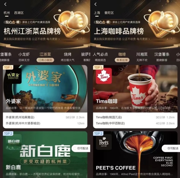 8月25日,餓了么在上海、杭州率先發(fā)布了首批“餓了么放心點(diǎn)·榜”。據(jù)悉,首批榜單除了篩選出全城100家外賣(mài)品牌外,還基于咖啡、燒烤、江浙菜等八大外賣(mài)熱門(mén)品類(lèi)各公布了百?gòu)?qiáng)品牌名單。
