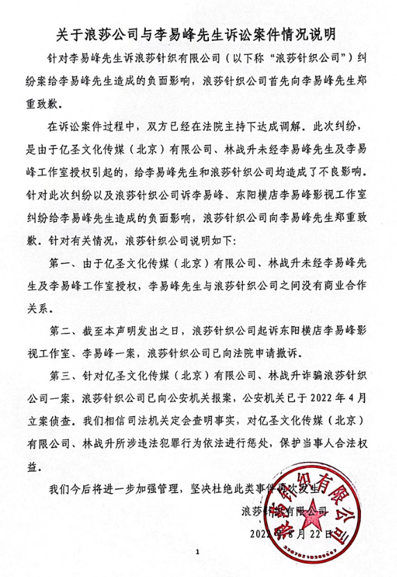 該說明指出,由于億圣文化傳媒(北京)有限公司、林戰(zhàn)升未經(jīng)李易峰及李易峰工作室授權(quán),故李易峰與浪莎并無商業(yè)合作關(guān)系。此外,就起訴李易峰及其工作室一案,浪莎已經(jīng)向法院申請撤訴,同時(shí)針對億圣文化傳媒(北京)有限公司、林戰(zhàn)升詐騙浪莎一案,已經(jīng)向公安機(jī)關(guān)報(bào)案。