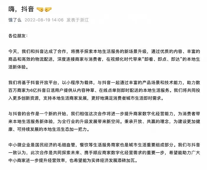 現(xiàn)在,抖音決定與餓了么聯(lián)手。依據(jù)合作,餓了么會在抖音中開發(fā)小程序,借用抖音6億日貨為商家提供內(nèi)容種草、在線點(diǎn)單、即時配送等本地生活服務(wù)。雙方將投入更多資源,滿足消費(fèi)者需求。