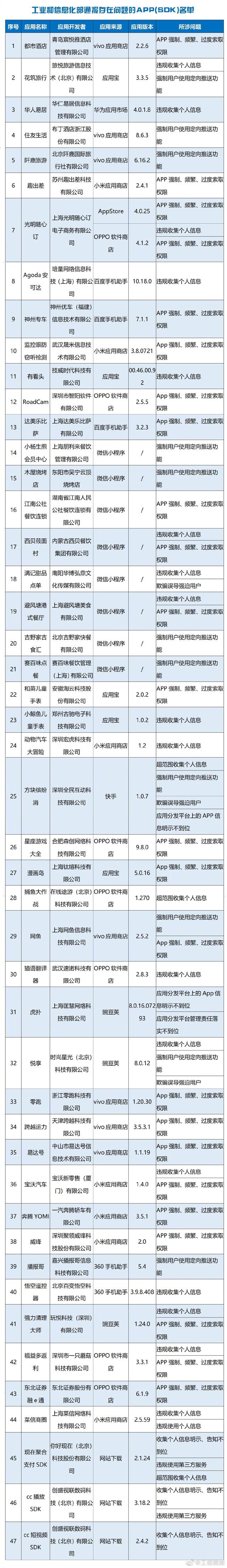 截至目前,尚有47款A(yù)PP(SDK)未按要求完成整改,虎撲、神州專車、達(dá)美樂披薩、零跑、小楊生煎、避風(fēng)塘、西貝、吉野家等在列。