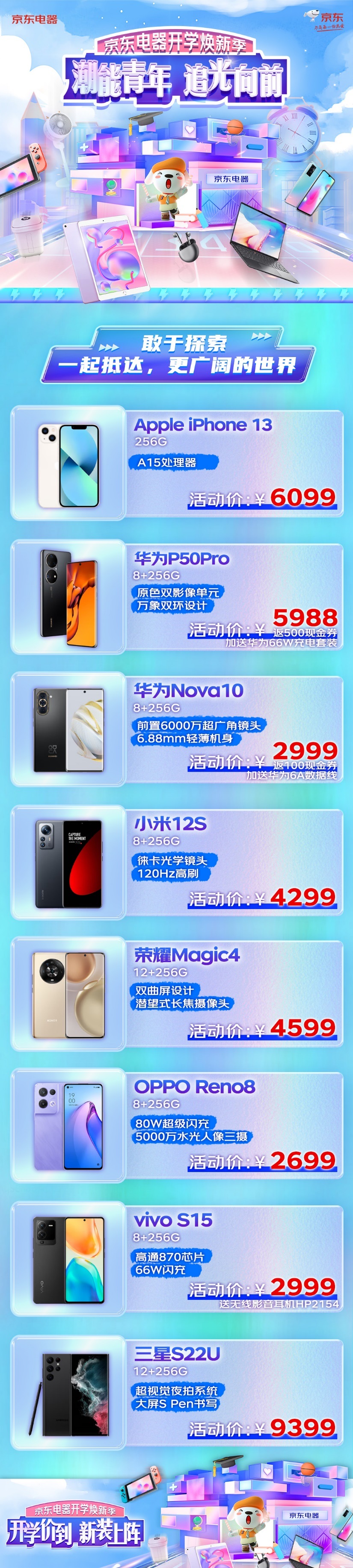 為了讓學(xué)生群體選購合適的電子產(chǎn)品,京東五星電器、京東電器特意奉上3C產(chǎn)品“購機攻略”,幫助學(xué)生黨早日選中心儀的產(chǎn)品。手機方面,iPhone13、華為P50 Pro、華為Nova10、小米12S、榮耀Magic4、OPPO Reno8、vivo S15、三星S22U等都推出前所未有的活動價,還加贈各種豐富好禮。