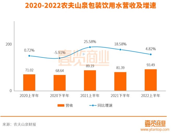 包裝飲用水作為農(nóng)夫山泉的核心產(chǎn)品,上半年?duì)I收93.49億元,與去年同期相比增長4.8%。這是自2021年以來的最低增速,與2021年上半年相比增速下滑超過了20個(gè)百分點(diǎn)。