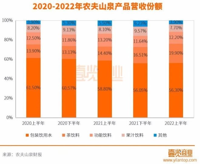 值得關(guān)注的是,茶飲料行業(yè)占總收益的比例一直在上升,從2020年的13.9%、2021年的14.4%,到今年上半年的19.9%。農(nóng)夫山泉茶飲料表現(xiàn)亮眼主要是因東方樹葉、茶π等經(jīng)典產(chǎn)品口味及新口味在營銷的推動(dòng)下表現(xiàn)良好。