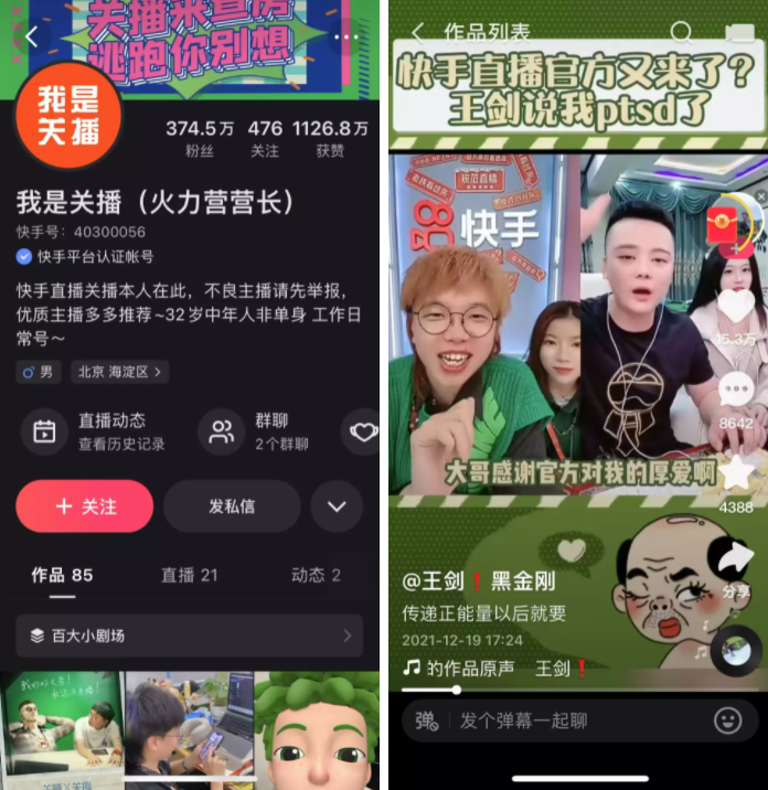 “我是關(guān)播”賬號信息及與主播連麥短視頻內(nèi)容 來源 / 快手截圖