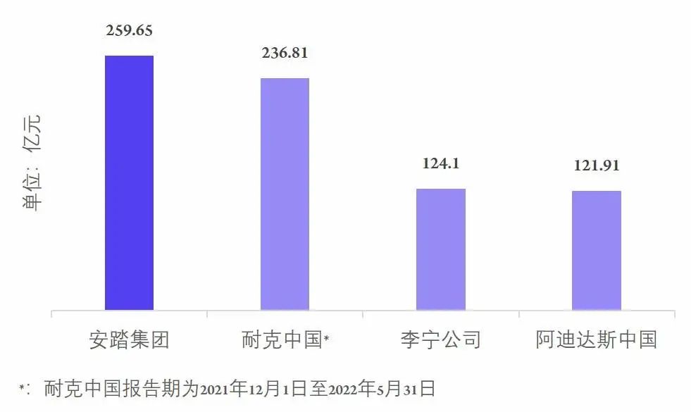 財報顯示,2022年上半年,安踏集團實現(xiàn)總收入259.65億元,同比增長13.8%,收入體量相當于同期的1.1個耐克中國、2.1個李寧、2.13個阿迪達斯。