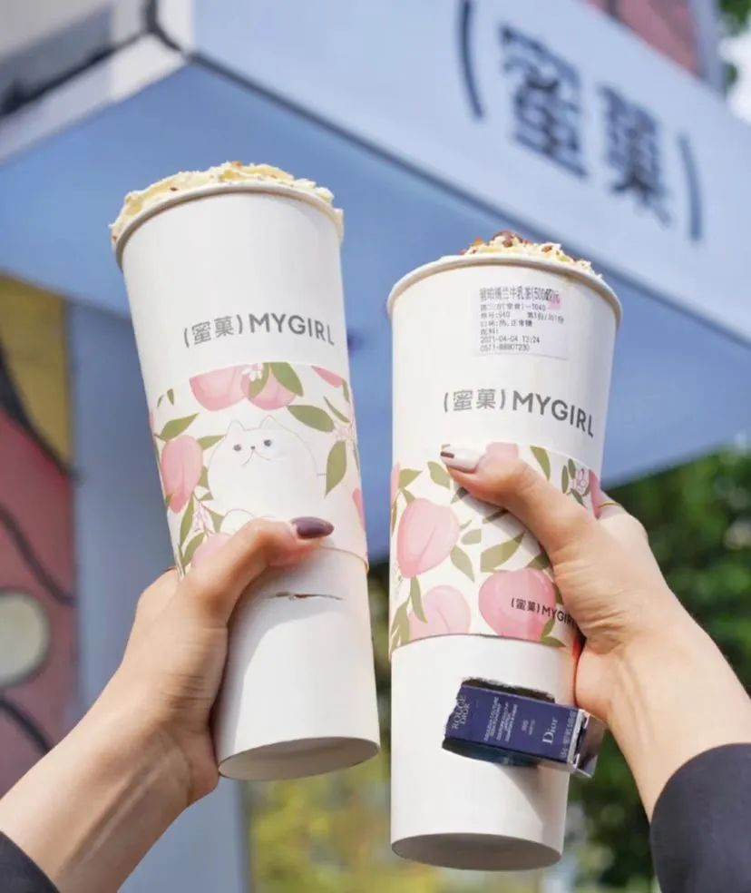 杭州茶飲品牌蜜菓去年推出的盲盒奶茶,個頭高底部空的中空杯,上方放奶茶,下面就是盲盒,有彩票、發(fā)卡、自助餐券等小禮品,還能開出大牌的口紅、眼影、散粉等“隱藏款”。