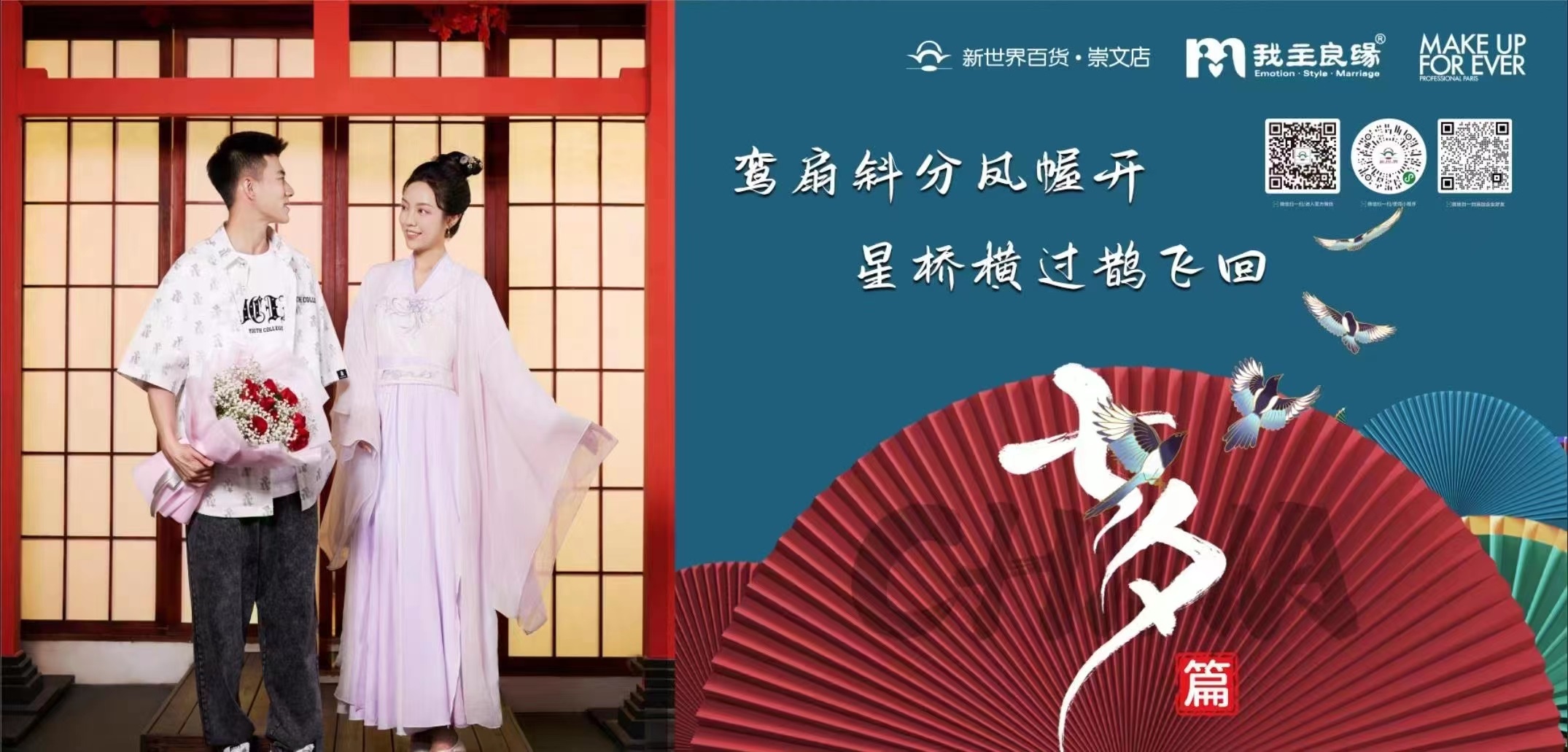 本次“農(nóng)歷七夕國風(fēng)大賞”在視覺呈現(xiàn)上,新世界百貨的制作團隊打破傳統(tǒng)思路。以古風(fēng)穿越為主線進行包裝,一古一今,模特穿搭上運用傳統(tǒng)飄逸古裝及場內(nèi)主流品牌服飾,漢服長裙凸顯書香氣息,現(xiàn)代服飾更有知性韻味,兩人仿佛路人擦肩而過,背景融入各節(jié)氣節(jié)點的風(fēng)俗及飲食特色。營造出一種時空交錯的美感。