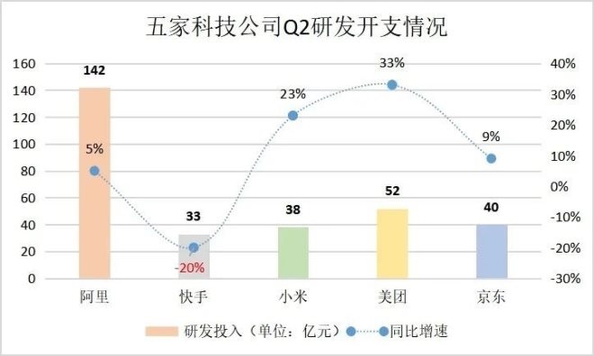 除騰訊財報制表沒有科研投入一項外,可以看到,五家科技公司中,僅有快手一家科研投入同比下滑20%。