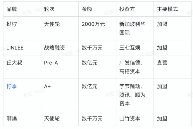 這一切始于去年下半年開始的手打檸檬茶融資潮。據(jù)36氪粗略統(tǒng)計(jì),從去年下半年到現(xiàn)在,共有數(shù)十億人民幣流入手打檸檬茶連鎖品牌。「LINLEE」曾于2021年7月獲數(shù)千萬(wàn)元戰(zhàn)略融資,三七互娛投資;同月,「丘大叔」宣布數(shù)億元Pre-A輪融資,投資方老股東廣發(fā)信德、高榕資本;年初,「檸季」獲數(shù)億元A+輪融資,投資方為字節(jié)跳動(dòng)、騰訊、順為資本;最近,「啊爆檸檬茶」獲數(shù)千萬(wàn)元人民幣天使輪融資,投資方為山竹資本。