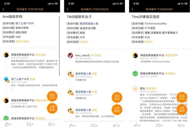 而在黑貓投訴平臺(tái)上,也存在一些“不滿”:“Tims咖啡異物”“Tims咖啡有蟲子”“Tims涉嫌強(qiáng)買強(qiáng)賣”,一些投訴已經(jīng)處理,給予一定數(shù)量賠償,而有一些投訴仍在處理當(dāng)中。