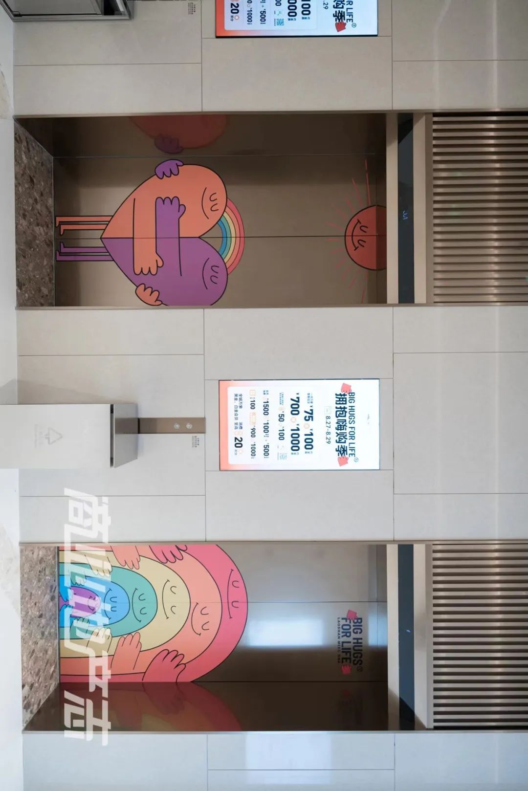 而Huggers 抱抱人形象,也不僅僅出現(xiàn)在了深圳路沿線,而是在幾乎可以想象到的任何地方,包括但不限于玻璃幕墻、指示牌、電梯間、開業(yè)邀請函、T恤、帆布包、氣球。