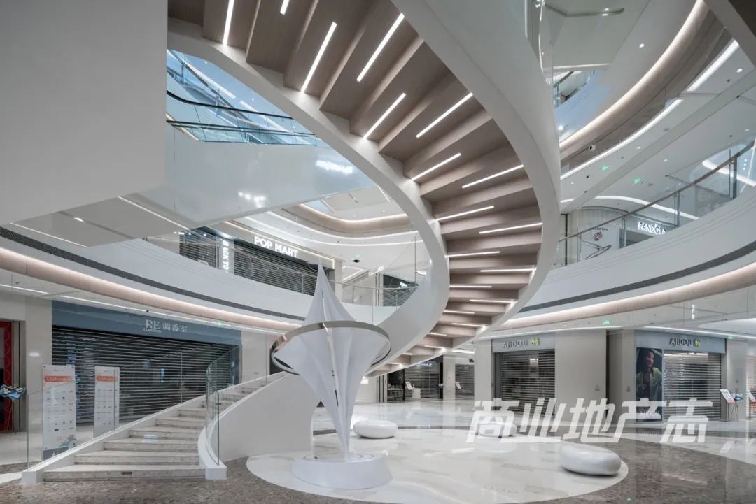 作為一個極致追求經(jīng)營面積的項目,特色空間是「奢侈品」。我全場轉(zhuǎn)下來,最為引入注目的特色空間,是項目在L1層入口附近打造的直通LG1層的景觀旋轉(zhuǎn)樓梯。