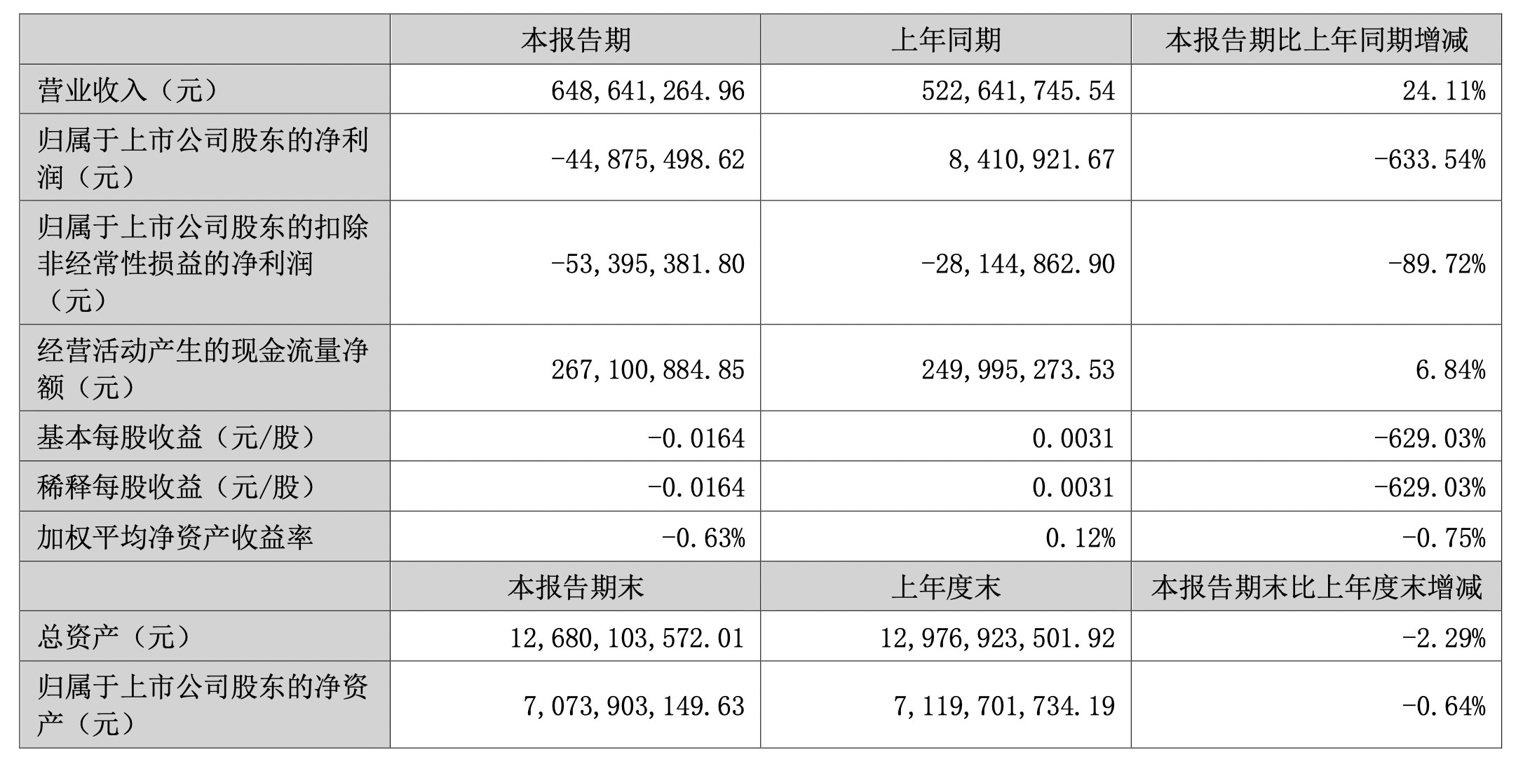 報(bào)告期內(nèi),該公司實(shí)現(xiàn)營業(yè)收入約6.49億元,同比增加24.11%;歸屬于上市公司股東的凈利潤為-4487.55萬元,同比減少633.54%;歸屬于上市公司股東的扣除非經(jīng)常性損益后的凈利潤為-5395.54萬元,同比減少89.72%。