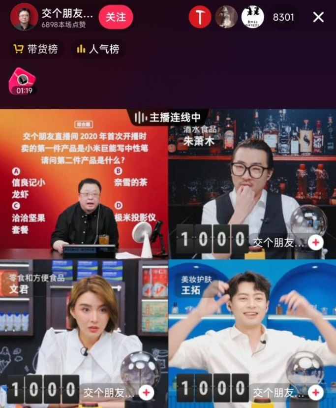在8月23日晚的一場(chǎng)直播中,羅永浩以答題節(jié)目主持人的身份,與交個(gè)朋友旗下的多位主播連麥,玩起了“有獎(jiǎng)問答”直播。在內(nèi)容上,將直播帶貨玩出了新的花樣。