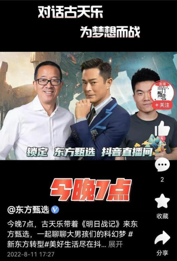 比如,電影《新神榜:楊戩》的導(dǎo)演趙霽做客東方甄選,與俞敏洪等人聊起了電影創(chuàng)作的相關(guān)知識(shí);電影《明日戰(zhàn)記》主演古天樂也在8月11日來到直播間,暢聊電影背后的猛料,直播間實(shí)時(shí)在線人數(shù)最高達(dá)到70W。