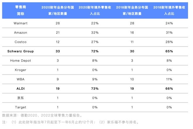更有意思的是,從境外零售收入占比來看,Schwartz Group和ALDI在2020財年的這一占比從2018財年的65-66%攀升至72-73%,遠高于排名前三的Walmart、Amazon、Costco(約20-30%)。