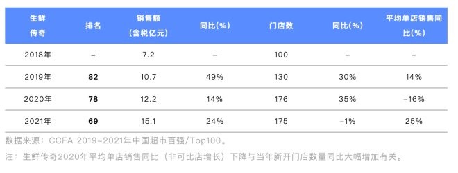 根據(jù)2021年CCFA中國超市Top100榜單,生鮮傳奇含稅銷售額為15億元,同比增長24%,增長率在100家上榜企業(yè)中名列第四。