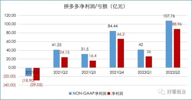 拼多多Q2的盈利表現(xiàn)同樣彪悍。Q2實(shí)現(xiàn)凈利潤88.96億元,同比增長268%;Non-GAAP凈利潤107.76億元,同比增長161%,創(chuàng)上市以來最好的利潤成績。