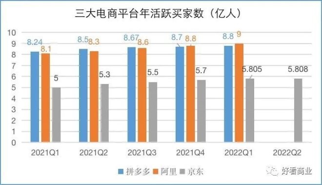 用戶方面,阿里國內(nèi)年活躍用戶達(dá)10億,國內(nèi)商務(wù)達(dá)到9億后,Q2開始已經(jīng)不再披露用戶數(shù)據(jù)。拼多多Q2也未披露用戶數(shù)據(jù)。京東的年活躍用戶在Q2環(huán)比也只新增了30萬。
