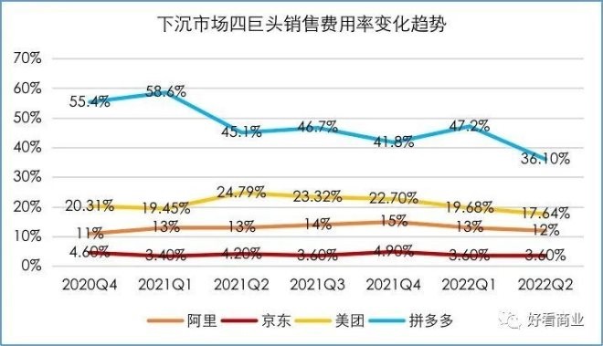 橫向?qū)Ρ劝⒗、京東、美團(tuán),拼多多的銷售費(fèi)用率一直是排名靠前的選手。