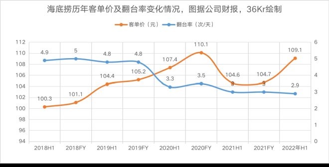海底撈門店客單價(jià)及翻臺(tái)率表現(xiàn),36Kr繪制