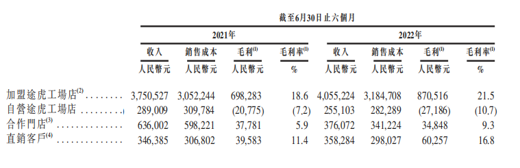 期間途虎自營門店虧損2719萬,但加盟模式則實現(xiàn)毛利8.71億元,毛利率21.5%。同時,合作門店毛利率為9.3%,低于加盟模式,但高于自營模式。