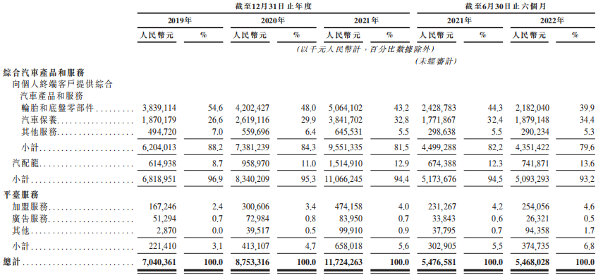 其中,來自于輪胎和底盤零部件、汽車保養(yǎng)的收入貢獻均較高。