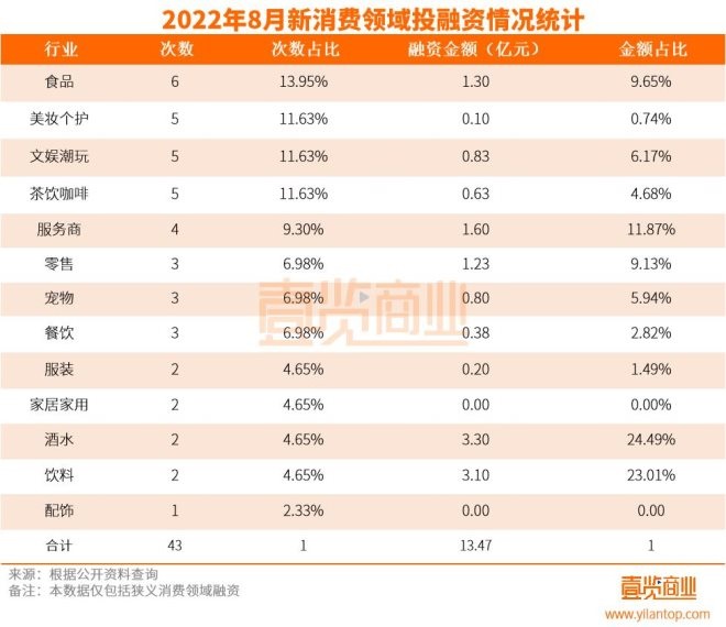 從賽道來看,8月份的融資事件主要集中在食品、美妝個(gè)護(hù)、文娛潮玩和茶飲咖啡上,各領(lǐng)域的融資事件分別達(dá)到6起、5起、5起、5起。雖然酒水賽道和飲料賽道融資事件均只有2起,但整體融資金額占比為前兩名,分別為24.49%和23.01%。