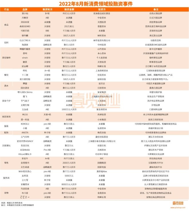 食品領(lǐng)域在8月份一共獲得融資6起,1.3億元。在消費(fèi)賽道持續(xù)遇冷的環(huán)境下,一個(gè)很明顯的變化是,非剛需品牌的消費(fèi)品需求正在不斷下滑,但食品作為剛需消費(fèi)品,在新消費(fèi)領(lǐng)域仍然熱門。