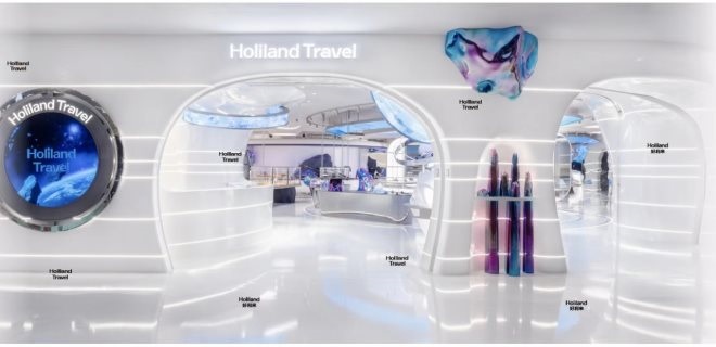 據(jù)官方介紹,全國首家Holiland?Travel主題店延伸自然旅行的概念,構(gòu)筑未來主義的漫游空間,用科幻場景承載甜品內(nèi)核,旨在為顧客提供一場未知的時(shí)空旅行。