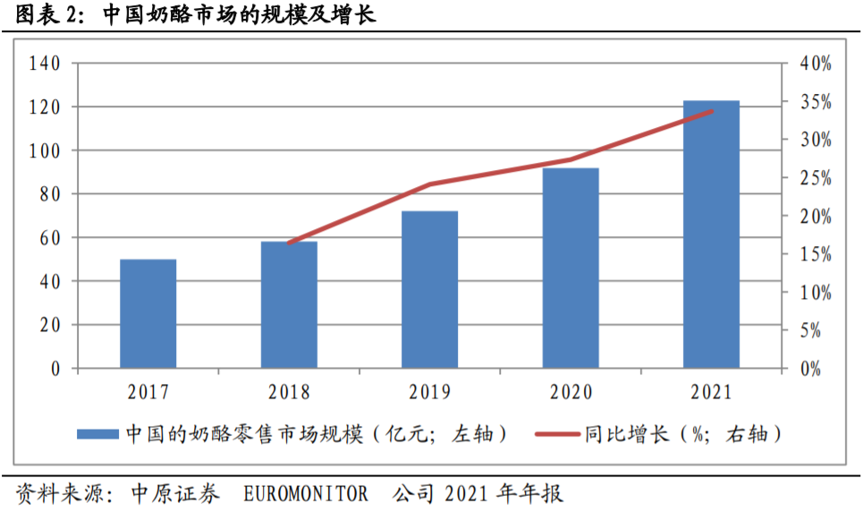 奶酪作為乳制品行業(yè)新興領(lǐng)域,是典型的高增長(zhǎng)藍(lán)海賽道。雖然目前整體市場(chǎng)空間較小,但隨著西方飲食文化在國(guó)內(nèi)逐漸普及,市場(chǎng)想象空間廣闊。