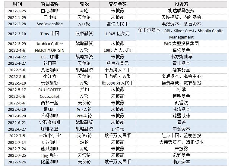 天眼查不完全統(tǒng)計,進(jìn)入2022年來,咖啡賽道發(fā)生的融資事件超過20起。其中不乏咖啡之翼、Seesaw coffee等明星項目。同時,為實現(xiàn)新的市場增量,“茶顏悅色、喜茶”等茶飲品牌加入了戰(zhàn)局。