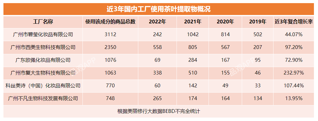工廠端對(duì)該成分的青睞也急劇攀升。據(jù)美麗修行大數(shù)據(jù),2019年—2022年,工廠使用茶葉提取物的產(chǎn)品數(shù)量大幅增長,如廣州市復(fù)大生物科技有限公司,有超千款商品含有茶葉提取物,近三年復(fù)合增長率高達(dá)232.97%;科絲美詩近三年含茶葉提取物的產(chǎn)品數(shù)量復(fù)合增長率也超過三位數(shù),達(dá)到107.44%。