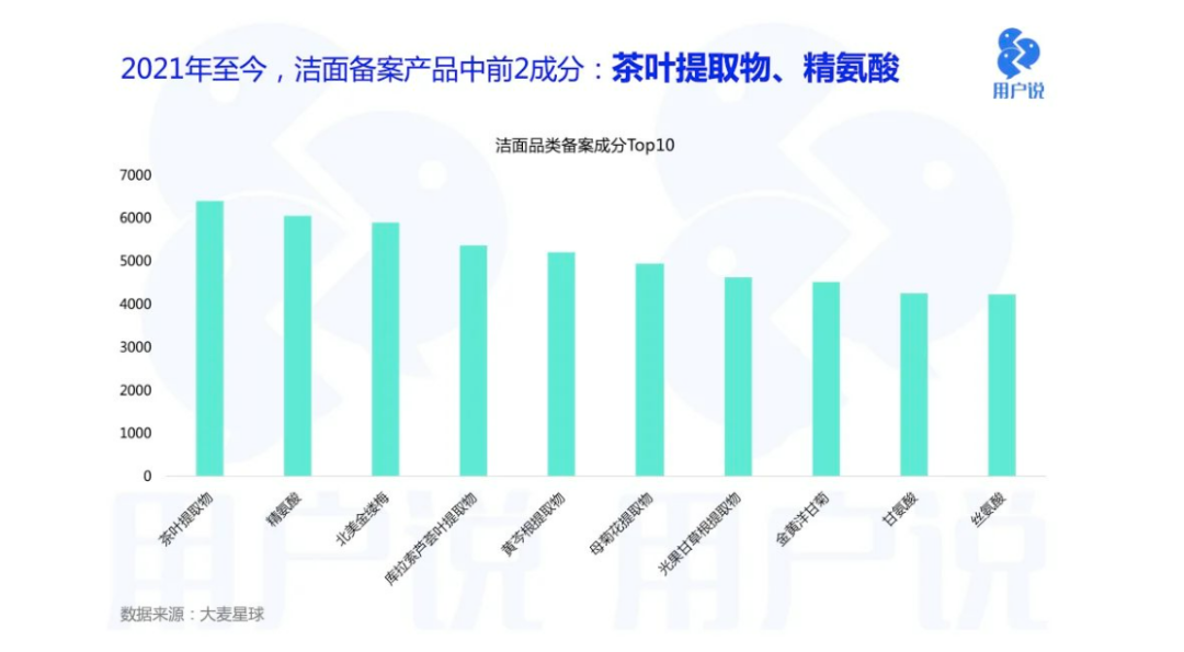此話并非空穴來風(fēng)。據(jù)用戶說數(shù)據(jù),2021年至今,潔面產(chǎn)品中前十的成分主旋律依舊是植物成分,其中,茶葉提取物拔得頭籌。