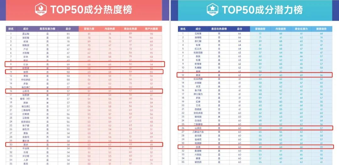成分熱度上,據(jù)巨量引擎頒布的《TOP50成分熱度榜》,紅茶、綠茶、山茶花、黑茶躋身TOP30;而在《TOP50成分潛力榜》中,黑茶、山茶花、白茶亦榜上有名,其中黑茶位居第12名,熱度甚至超過紅沒藥醇與二裂酵母。