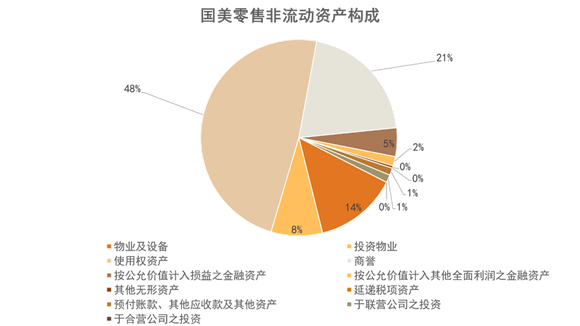 資產(chǎn)組成中,非流動(dòng)資產(chǎn)占比66.36%,規(guī)模前五位的科目分別是使用權(quán)資產(chǎn)、商譽(yù)、物業(yè)及設(shè)備、投資物業(yè)以及按公允價(jià)值計(jì)入損益的金融資產(chǎn),這幾個(gè)科目的數(shù)額總共占非流動(dòng)資產(chǎn)96%。