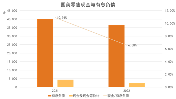 國美零售在2021年中和2022年中的有息負(fù)債規(guī)模(包括應(yīng)付票據(jù)、長期和短期的計(jì)息銀行及其他借款、衍生金融負(fù)債等科目數(shù)額之和)分別為401億和366億,在本報(bào)告期用現(xiàn)金償還債務(wù)以后,貨幣資金與有息負(fù)債的比例從10.91%下降到6.58%。