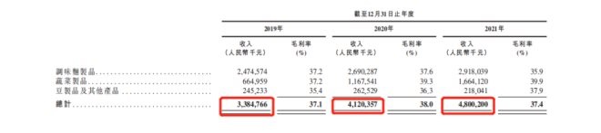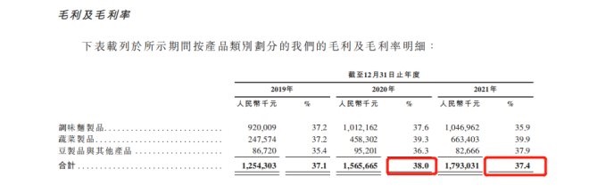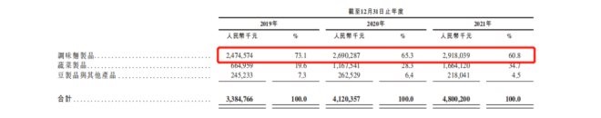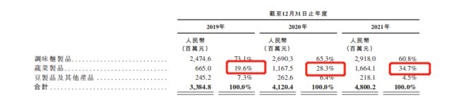 據(jù)其招股書顯示,在主業(yè)調(diào)味面制品之外的蔬菜制品,其在營收中的占比,已從2019年的19.6%,上漲到了2021年的34.7%。
