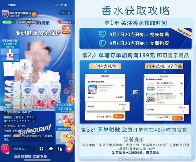 今日晚8點(diǎn),青眼通過舒膚佳官方直播間直播間了解到,在全店單筆訂單滿199元或買指定199元的組合套裝,即可于9月6日晚8點(diǎn)搶購紀(jì)念版舒膚佳純白香水,首批香水限量1萬份。據(jù)主播介紹,第二批香水將于9月12日在官網(wǎng)直播間與見面,目前僅此一款香型的香水。截至發(fā)稿,直播有6萬觀看量,遠(yuǎn)高于9月1日2.9萬的觀看。