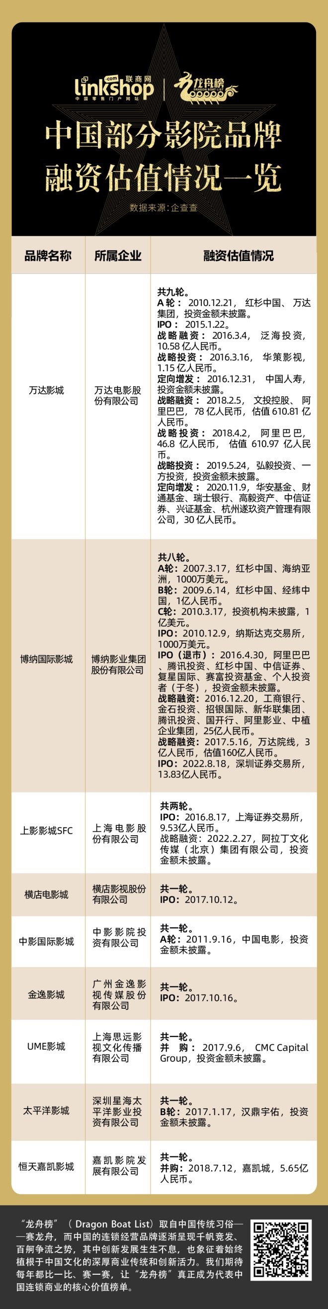 面對如此現(xiàn)狀,承載影院行業(yè)的實(shí)體影院有何表現(xiàn)?本期,《聯(lián)商網(wǎng)》特別推出龍舟榜之“2022年度電影院連鎖品牌TOP20”,從門店數(shù)據(jù)、消費(fèi)者滿意度、票房排行、融資情況四個(gè)維度對電影院連鎖品牌進(jìn)行分析觀察,呈現(xiàn)行業(yè)發(fā)展現(xiàn)狀,展望未來發(fā)展趨勢。