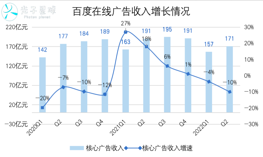 第二季度,百度在線廣告收入為171億元,同比下滑10%,在百度核心收入中的占比為74%,相比去年同期的79%有所降低。