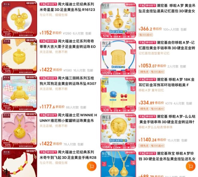 米老鼠、哆啦A夢、兔斯基都有了正版授權的黃金飾品。它們通常都采用3D硬金或者5G黃金工藝,彌補了傳統(tǒng)黃金因為質(zhì)地軟導致的造型局限問題。而且在同樣的克重下,體積能做到傳統(tǒng)產(chǎn)品的3倍,讓年輕人有一種物超所值的感覺。