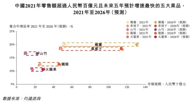 據(jù)灼識咨詢數(shù)據(jù)顯示,未來五年,榴蓮、車厘子、山竹、龍眼及或火龍果是中國2021年零售額超100億元水果品類中增速最快的五大品類。
