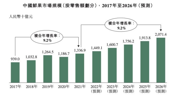 中國是世界上最大的水果消費國。據(jù)灼識咨詢數(shù)據(jù)顯示,中國鮮果零售市場規(guī)模已由2017年的9390億元增至2021年的1.34萬億元,復(fù)合年增長率約9.2%。