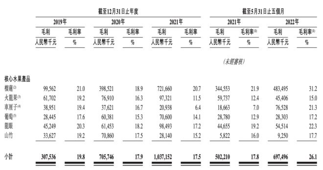 洪九果品核心水果的毛利率為17.5%,毛利率最高的水果是榴蓮,三年來毛利率位于18.9%—21%;瘕埞、葡萄、龍眼、山竹這四類核心水果的毛利率接近公司綜合毛利。