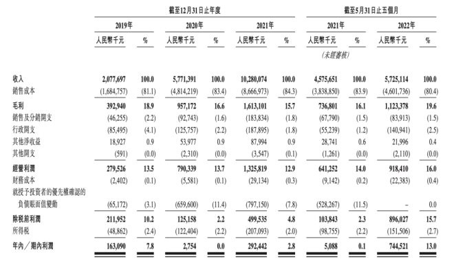 但洪九果品的毛利并不高,近幾年還呈下降趨勢,直到今年5月開始好轉(zhuǎn)。2019年至2021年以及2022年前5個月,洪九果品的毛利分別為3.93億、9.57億元、16.13億元、11.23億元。