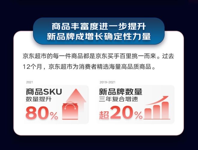 2021年,京東超市實(shí)現(xiàn)銷售額50%以上增長的細(xì)分品類近800個(gè);截至2021年,連續(xù)三年實(shí)現(xiàn)銷售額年復(fù)合同比增長超50%的細(xì)分品類超700個(gè)。