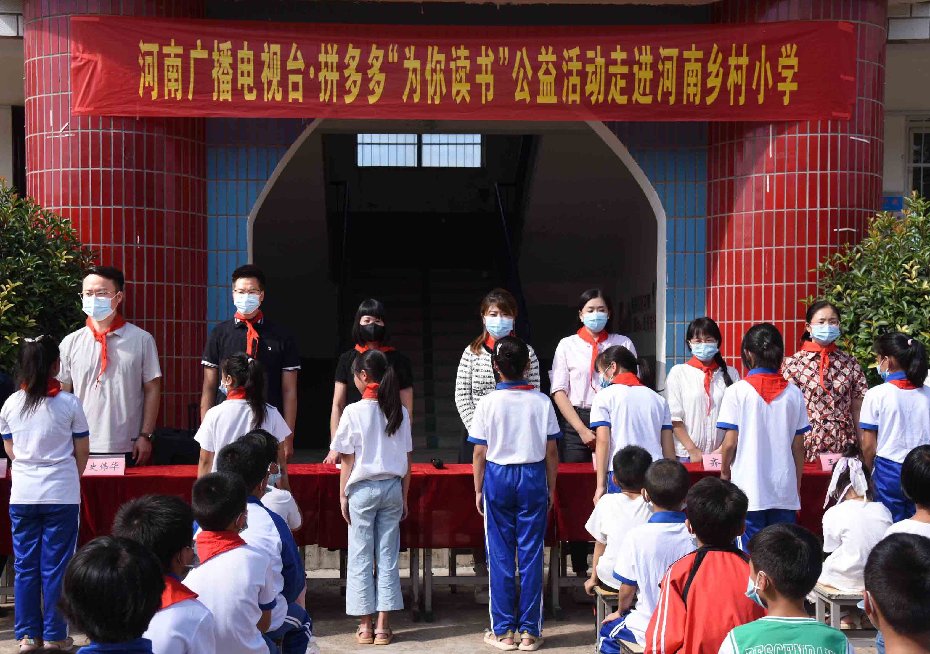 (河南廣播電視臺(tái)聯(lián)合拼多多“為你讀書”公益行動(dòng)向河南省鄉(xiāng)村小學(xué)捐贈(zèng)圖書。河南省委宣傳部派駐駐馬店上蔡縣邵店鎮(zhèn)高李村第一書記史偉華(左一),河南廣播電視臺(tái)愛之聲工作室負(fù)責(zé)人、一本書公益項(xiàng)目發(fā)起人穆迪(左四)等嘉賓參與愛心捐贈(zèng)。攝:王夢(mèng)楠、董旭)