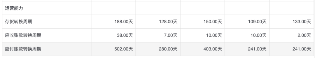其中,報(bào)告期內(nèi),其存貨周轉(zhuǎn)周期升至188天,去年同期為128天;應(yīng)收賬款轉(zhuǎn)換周期為38天,去年同期為7天;應(yīng)付賬款轉(zhuǎn)換周期為502天,去年同期僅為280天。再往前看,以上三個(gè)數(shù)值均創(chuàng)下國美零售自2008年以來的最高值,運(yùn)營效率下滑明顯。