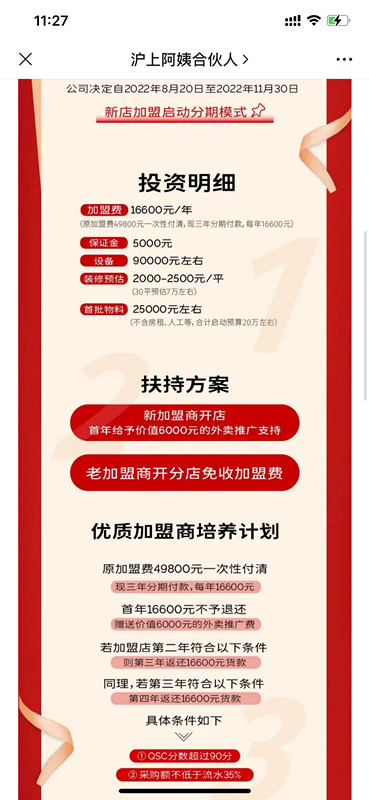 9月2日,滬上阿姨在“滬上阿姨合伙人”公眾號發(fā)布了“百日千店”加盟政策公告。